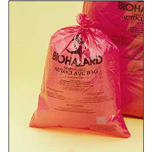 - Red bags printed with standard biohazard warning symbol and precautionary procedures in four languages: English, French, German and Spanish