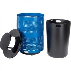Global Industrial Outdoor Perforated Steel Trash Can W/Rain Bonnet Lid & Base, 36 Gallon, Blue