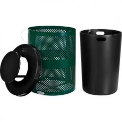 Global Industrial Outdoor Perforated Steel Trash Can With Rain Bonnet Lid, 36 Gallon, Green