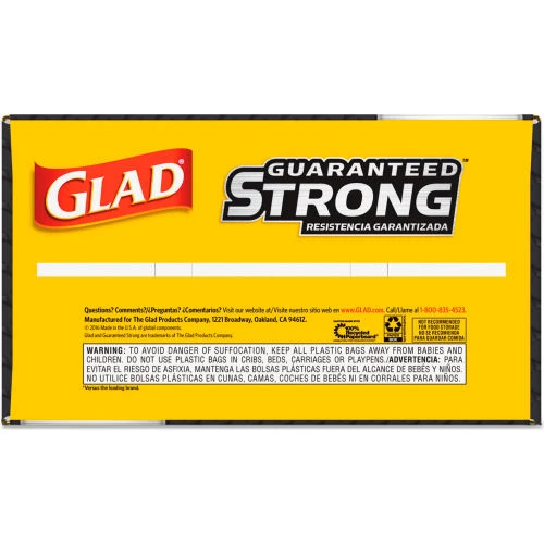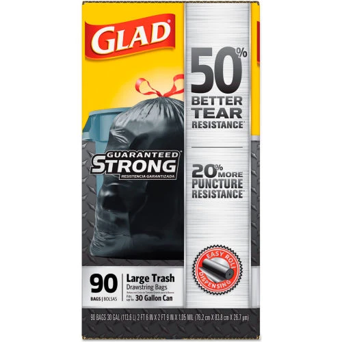 Glad® Drawstring Trash Bags are Guaranteed Strong for heavy-duty jobs, indoors or out. These 30 gallon black trash bags have 50% better tear resistance, 20% more puncture resistance and have a stronger drawstring versus the leading brand. Perfect for outdoor yard work and garage use, these garbage bags are tough enough for all occasions and are great for use throughout the workplace or home. The strong drawstring makes closing and carrying easy. Just pull the drawstring to enclose the trash, lift and toss into garbage. Ideal for use in restaurants, cafeterias, janitorial, and other commercial facilities. You can count on Glad® bags to contain your messiest trash.