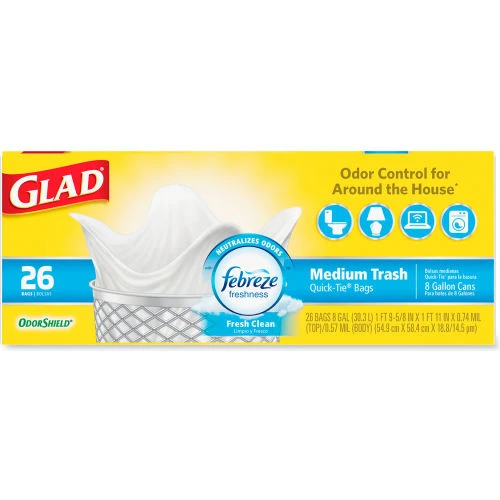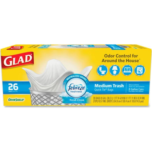 Glad OdorShield Quick-Tie Small Trash Bags with Febreze provide strength plus odor control, to keep homes and workplaces smelling fresh and clean. These small garbage bags are made with OdorShield technology and Febreze freshness to provide continuous odor neutralization, based on time lapse technical evaluation, for long lasting freshness around the house or workplace. They are also strong and sturdy to avoid messy trash disasters as you transport it. These 4 gallon size trash bags, in Fresh Clean scent, fit small size trash cans and are great for use in restroom, kitchen, desk and break room bins. Ideal for schools, offices and daycare centers.