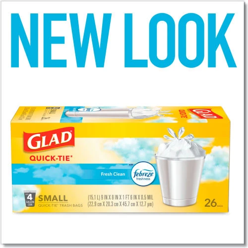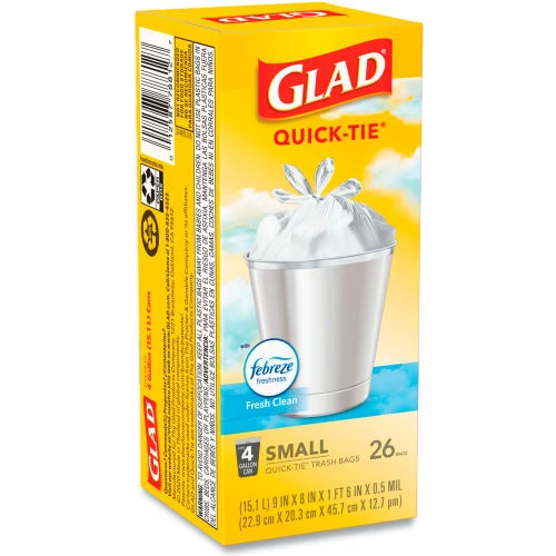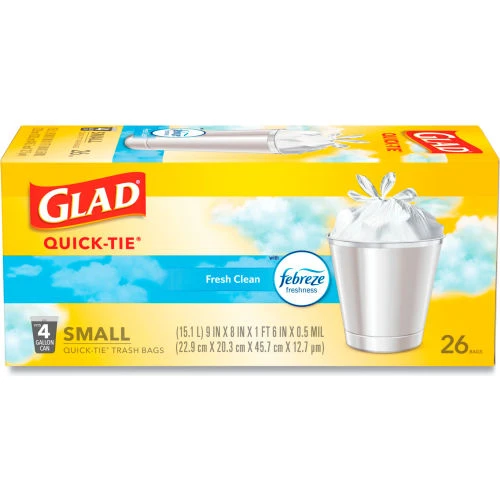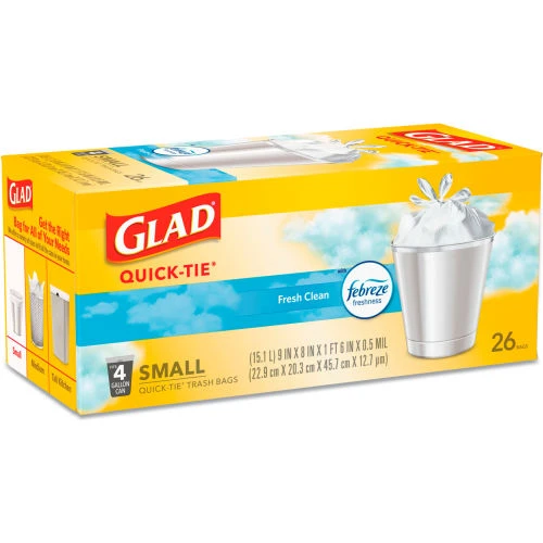 Glad OdorShield Quick-Tie Small Trash Bags with Febreze provide strength plus odor control, to keep homes and workplaces smelling fresh and clean. These small garbage bags are made with OdorShield technology and Febreze freshness to provide continuous odor neutralization, based on time lapse technical evaluation, for long lasting freshness around the house or workplace. They are also strong and sturdy to avoid messy trash disasters as you transport it. These 4 gallon size trash bags, in Fresh Clean scent, fit small size trash cans and are great for use in restroom, kitchen, desk and break room bins. Ideal for use in schools, daycare centers, restaurants, hotels and other commercial facilities.