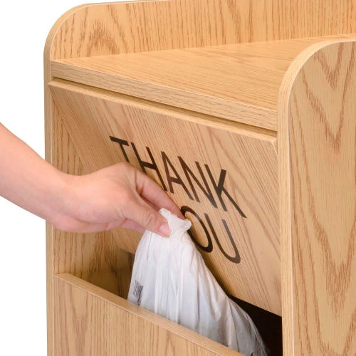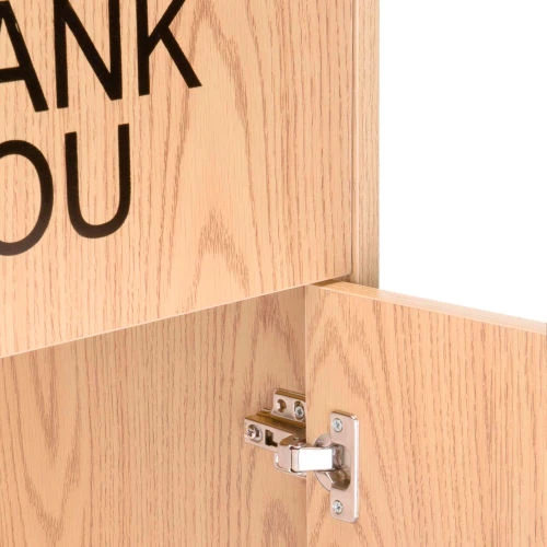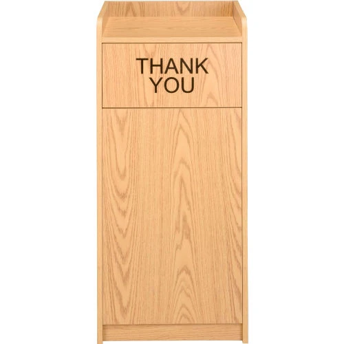 This industrial grade waste receptacle is designed to complement office and commercial cafeteria settings and to endure heavy use. Constructed of 5/8″ thick particle board with a melamine finish, giving this wooden waste receptacle a neat, attractive appearance. Simply open the hinged door to easily empty the durable 36 gallon plastic liner (sold separately). The push door (Measures 19″W x 9″H) is reversible with Thank You message on one side. Tray area measures 19″W x 18-1/4″D x 2-1/4″H. Some assembly required.