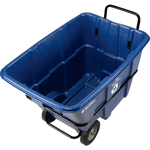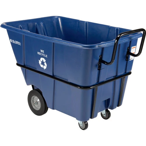 Global Industrial™ Heavy Duty Plastic Tilt Truck is reinforced with steel side rails that support the truck when carrying heavy loads and is ideal for collecting, transporting and dumping bulky materials. Its seamless blue color plastic body won’t rust, dent, chip, peel, corrode, or absorb moisture; will withstand exposure to many chemicals and can be cleaned with high-pressure jets of water or steam. Body has white WE RECYCLE logo to easily identify it as a recycling tilt truck. Two 10″ axle-mounted solid rubber load wheels, a galvanized hub, and two 4″ TPU polyurethane swivel casters provide maximum maneuverability even under heavy loads.