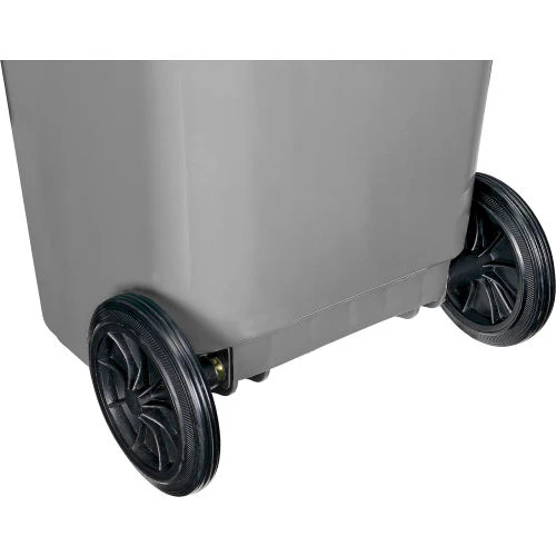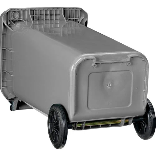 Store and move garbage waste with ease using these mobile trash containers. Mobile waste containers are made using impact and corrosion resistant high density polyethylene. Trash cans are reinforced at stress points for durability. Mobile garbage cans have a hinged, tight fitting lid to contain odors and keep out rain. Trash containers allow easy tilt and roll mobility using a grip handle and two 7-1/2″ dia. axle-mounted wheels. 18″W outside wheel to outside wheel.