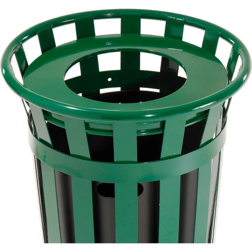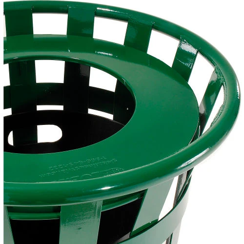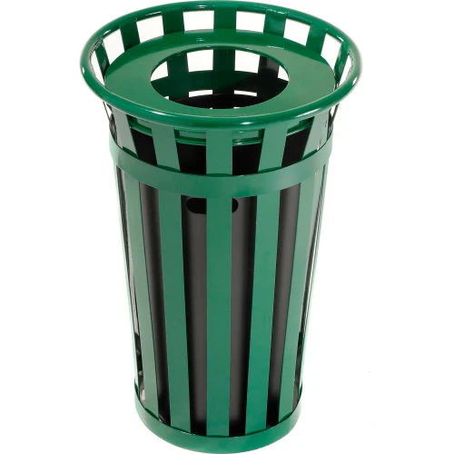 The 24-gallon Global Industrial Outdoor Green Steel Slatted Trash Can gives you a large capacity for rubbish with design and construction details that provide resistance to the elements, graffiti, and vandalism. The flat-bar steel slats are fully welded and treated with a polyester powder coat finish to create a durable receptacle that will hold up against harsh summer and winter weather.