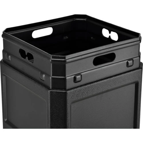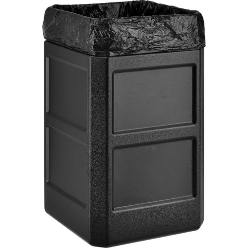 Square Plastic Waste Receptacle is ideal for use in high-traffic areas indoors or outdoors. The durable plastic construction will not rust, dent, or chip. Large 42 gallon capacity helps keep facilities clean. Dome lid with four 13″ x 6-1/4” openings protects the container and contents from the elements, and allows for easy trash disposal. Includes trash bag cinches to keep liners in place and hidden. Black color finish. Overall dimensions: 18-1/2″W x 18-1/2″D x 41-3/4″H.