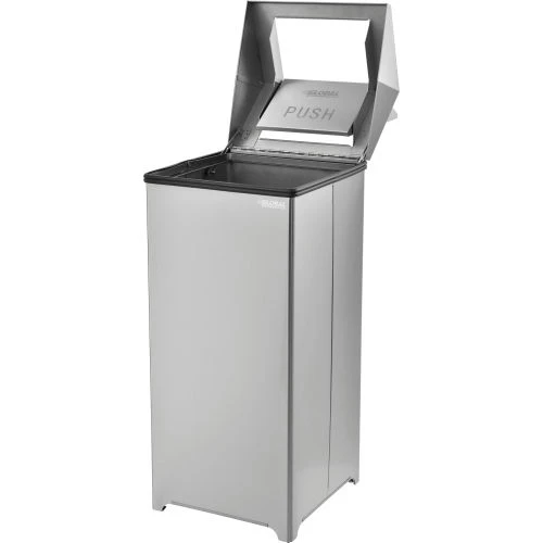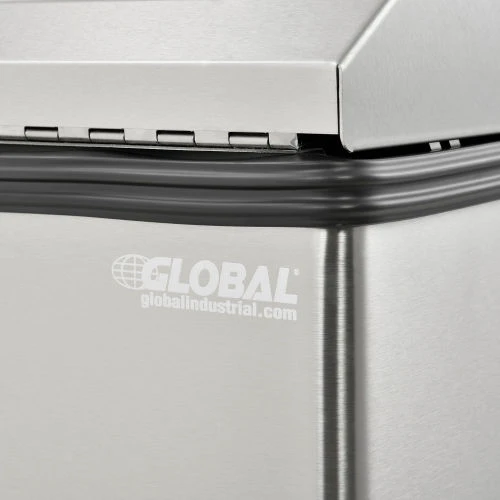 Global Industrial Stainless Steel Swing Top Receptacle is constructed from durable #305 grade stainless steel that is ideal for heavy duty use. The dual entry self-closing swing top lid allows for easy disposal and keeps trash out of sight, and is attached to the receptacle for easy maintenance. Folding retainer bands secure trash liners in place while also hiding them from view. Polished stainless steel finish features fingerprint proof treatment that helps keep the receptacle looking clean. Includes protective feet to prevent scratching and marring. OSHA compliant. 24 gallon capacity.