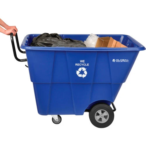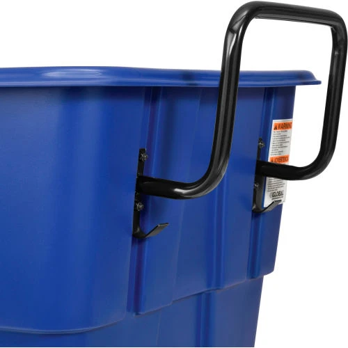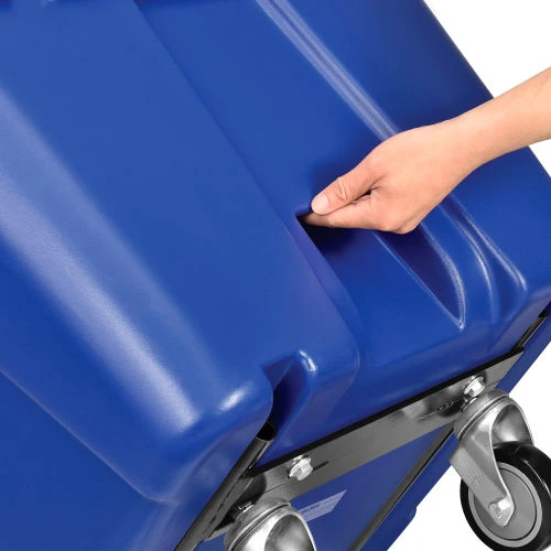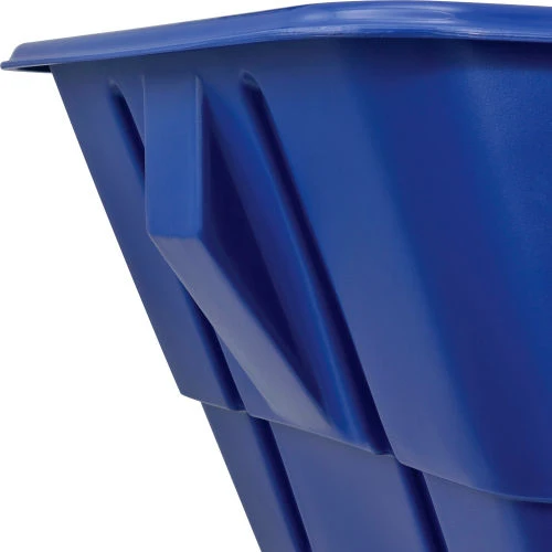 The one-piece seamless rotational molded blue polyethylene body cleans easily, won’t dent, rust or chip, and is leak-proof. Includes a white WE RECYCLE logo on both sides. Convenient push handle, with trash bag hooks, and lift handle provide secure handling. Two 9″ roller bearing rubber load wheels and two 4″ rubber swivel casters ensure maneuverability. Ships unassembled.