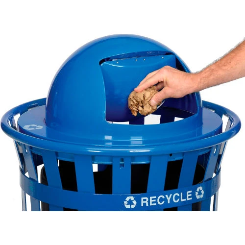 Dome lid helps keep waste out of sight and keeps rain or snow out of trash receptacle. Self-closing swing-action push door allows easy waste disposal. Includes three recycling logos for clear identification. Lid easily fits on 36 Gallon Slatted Metal Receptacles and 55 Gallon Steel Drums (sold separately). Measures 24″ Dia. x 10″H. Opening 11″W x 8″H.