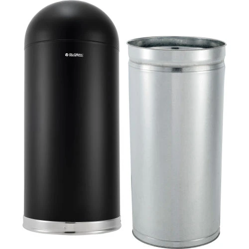 Upgrade your commercial space with the Global Industrial™ Steel Round Open Top Trash Can. The dome shaped top with opening allows users to dispose of trash quickly, helping to keep the surrounding areas cleaner, longer. The liner material is made of cost effective and noncorrosive galvanized steel that allows easier upkeep than receptacles with standard steel liners that may need to be examined more frequently. Its powder coated black finish blends perfectly into restaurant, café, and airport environments. 1 Year Limited Warranty. Measures: 34-7/16″ H x 15-3/8″ W x 15-3/8″ L.