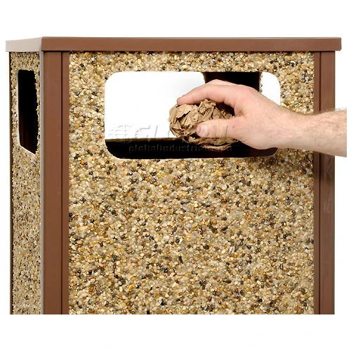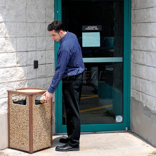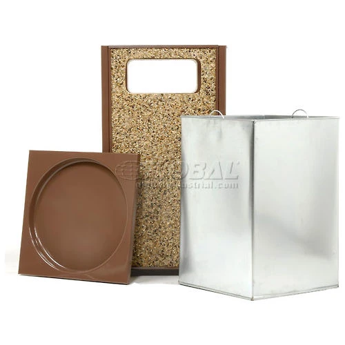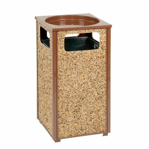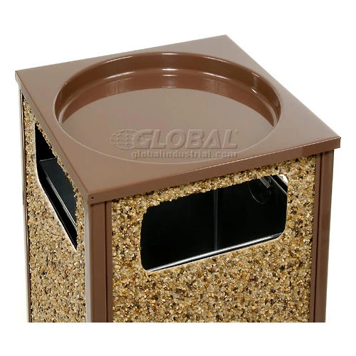The Global Industrial Stone-Panel Trash Sand Urn withstands extreme weather conditions and long-term daily use with a fire-safe and attractive stone finish. The stone panels are made out of reinforced resin material that maintenance and vandalism free finish. Top removes easily for emptying. Includes leak-proof, fire resistant removable galvanized steel liner with handles. Heavy steel frame construction provides stability. Includes fixed height feet for anchoring. Removable Sand Urn top for easy cigarette butt disposal. Ships assembled. Sand sold separately.