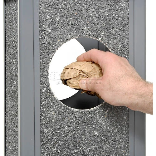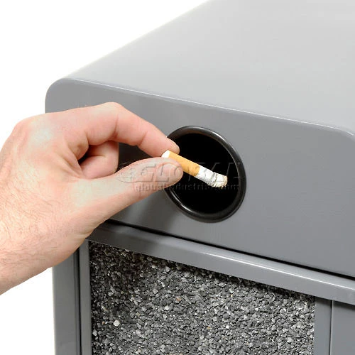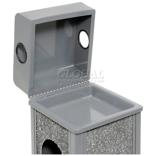 The Global Industrial Stone Panel Trash Weather Urn withstands extreme weather conditions and long-term daily use with a fire-safe and attractive stone finish. The stone panels are made out of reinforced resin material that maintenance and vandalism free finish. Top removes easily for emptying. Includes leak-proof, fire resistant removable galvanized steel liner with handles. Heavy steel frame construction provides stability. Includes fixed height feet for anchoring. Weather Urn conceals cigarette waste and features a piano hinge lid for easy cigarette butt disposal. Ships assembled. Sand sold separately.