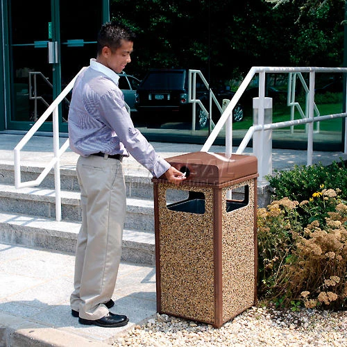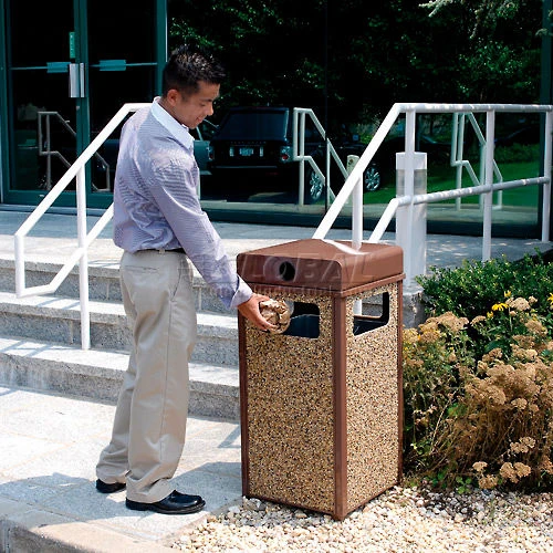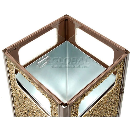 The Global Industrial Stone Panel Trash Weather Urn withstands extreme weather conditions and long-term daily use with a fire-safe and attractive stone finish. The stone panels are made out of reinforced resin material that maintenance and vandalism free finish. Top removes easily for emptying. Includes leak-proof, fire resistant removable galvanized steel liner with handles. Heavy steel frame construction provides stability. Includes fixed height feet for anchoring. Weather Urn conceals cigarette waste and features a piano hinge lid for easy cigarette butt disposal. Ships assembled. Sand sold separately.