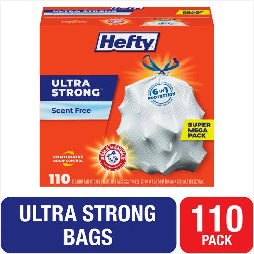 Strong and durable, easy to lift and carry. Convenient drawstring closure. Patented Arm & Hammer Odor Neutralizer eliminates garbage odors without adding any unwanted scents or fragrances, leaves your kitchen smelling the way you want.