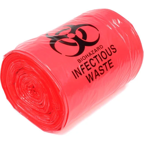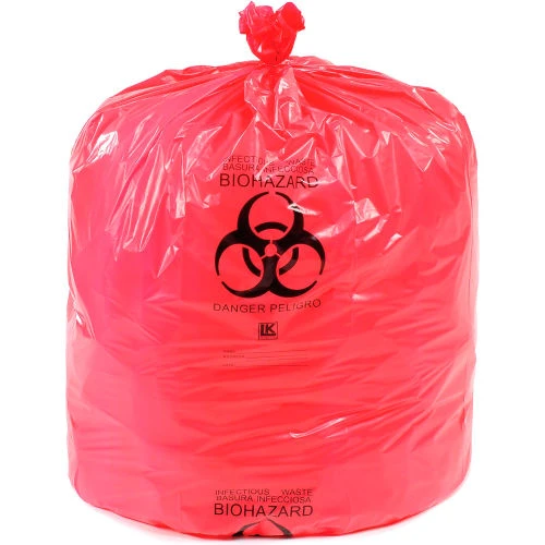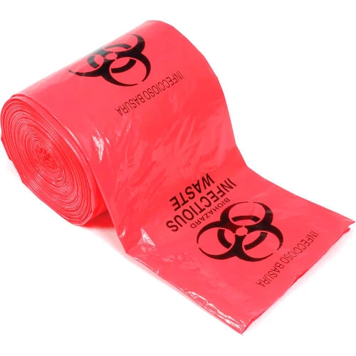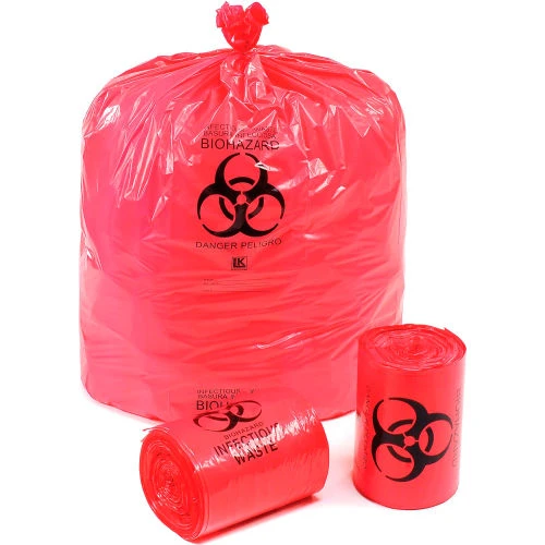 - Red colored bags with Biohazard symbol and warnings in English and Spanish printed in black