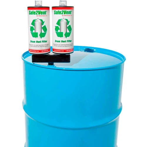 Safe2Vent dual coalescing carbon filter with the exclusive Viz-a-Ball indicator fits any 3/4″ bung fitting and is designed for use with higher production aerosol can manual puncturing units. The indicator tells you when the process is complete and it is safe to open the puncturing machine. The check ball ‘closes’ the drum when not processing for compliance with EPA and California regulations while allowing venting of any dangerous pressures to conform to OSHA guidelines. Both single and dual models use the same replacement filters. Designed for use with 55 gal drums. AeroVent aerosol can disposal system sold separately.