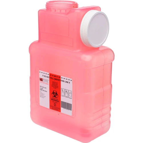 1.5 gallon red sharps container with 3″ safety column above maximum fill level, consistent total wall thickness ensures puncture-resistance, one-piece construction, on-board screw cap prevents leaks during transport and provides permanent closure once container is filled, mounting brackets available.