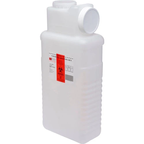 2.5 gallon translucent sharps container with 3″ safety column above maximum fill level, consistent total wall thickness ensures puncture-resistance, one-piece construction, on-board screw cap prevents leaks during transport and provides permanent closure once container is filled, mounting brackets available.