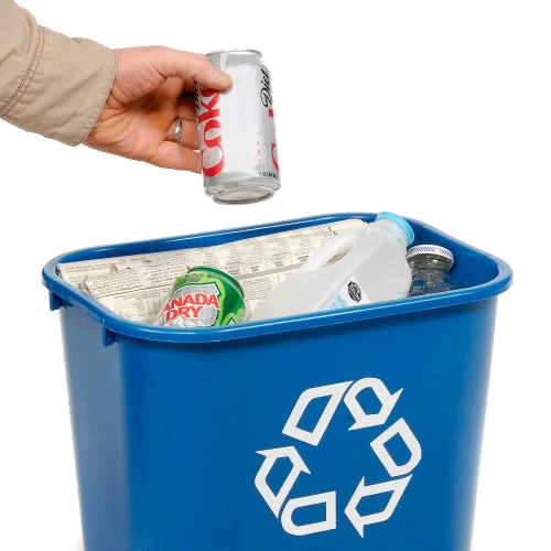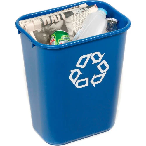 Ideal for use in office environments that recycle paper waste. Recycling container is made with post consumer recycled resin to exceed EPA guidelines. Blue recycled plastic container features large universal recycling logo for clear identification. Flanged top rim edging for extra strength.