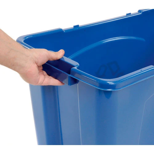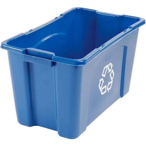 Place these containers wherever recyclables are generated. Ideal for offices, warehouses and lunch areas. Collection containers reduce handling costs and time by encouraging sorting. Bright blue color imprinted with Recycling logo identifies container to keep non recyclables out. Polyethylene construction won’t chip, rust or dent and withstands extreme weather conditions. Contains post consumer recycled resin to exceed EPA guidelines. Rectangle tote container is stackable for storage and shipping. Inboard handles for easy lifting and carrying.