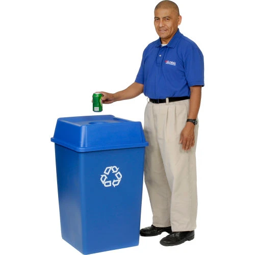 High capacity recycling collection for crowded areas. This recycling container is great for areas of high paper generation including near copiers, printers and in mailrooms. Recycling waste container can be used indoors and outdoors. Square recycling receptacle is made with post consumer recycled resin (PCR) to exceed EPA guidelines. Flanged top rim edging for extra strength. Blue recycled plastic container features a universal recycling logo for clear identification.