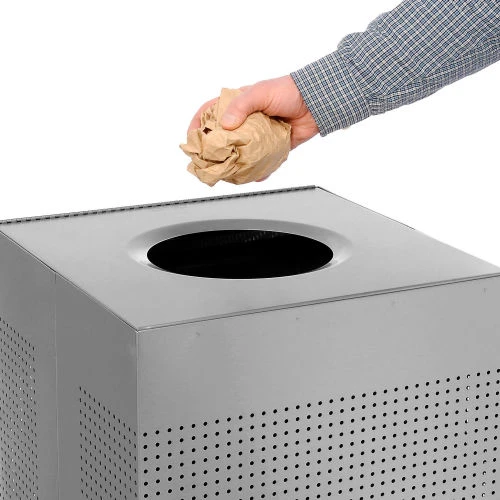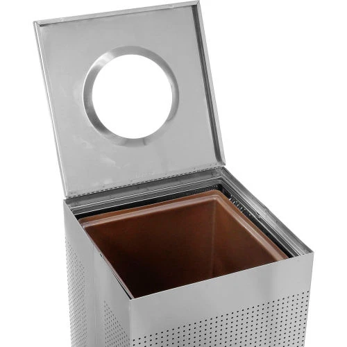 20 gallon perforated heavy gauge fire safe square steel receptacle. Silver Metallic Uni-Koat powder coated finish. Leak-proof rigid plastic liner along with folding retainer bands to neatly hold poly bags in place. Hinged top for easy emptying. Leg levelers for stability on uneven surfaces.