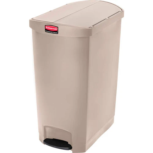 Slim Jim® step on trash containers are constructed with high-quality plastic that meet the needs of any environment with efficiency, safety, and durability. Slim profile and small footprint maximize space to fit in tightest spaces. Smooth surfaces and contoured edges are easy to clean. Rubbermaid® Slim Jim® container features a quiet and controlled lid-closure which minimizes noise, an internal hinge design that prevents wall damage and an increased foot pedal clearance for easier access and operation. Liner cinch easily and securely holds trash bag liners. Factory mutual certified ensures fire safety for regulatory compliance. Meets OSHA and OBRA standards for worker and environmental safety.