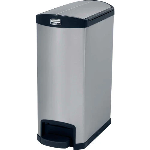 Slim Jim® step on stainless steel containers feature a fingerprint-resistant finish that seamlessly blend into any environment to provide an aesthetically pleasing and productive refuse solution. Slim profile and small footprint maximize space to fit in tightest spaces. Rubbermaid® Slim Jim® container includes a quiet and controlled lid-closure which minimizes noise, an internal hinge design that prevents wall damage and an increased foot pedal clearance for easier access and operation. Liner cinch easily and securely holds trash bag liners. Factory mutual certified ensures fire safety for regulatory compliance. Meets OSHA and OBRA standards for worker and environmental safety.