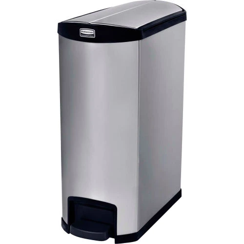 Slim Jim® step on stainless steel containers feature a fingerprint-resistant finish that seamlessly blend into any environment to provide an aesthetically pleasing and productive refuse solution. Slim profile and small footprint maximize space to fit in tightest spaces. Rubbermaid® Slim Jim® container includes a quiet and controlled lid-closure which minimizes noise, an internal hinge design that prevents wall damage and an increased foot pedal clearance for easier access and operation. Liner cinch easily and securely holds trash bag liners. Factory mutual certified ensures fire safety for regulatory compliance. Meets OSHA and OBRA standards for worker and environmental safety.