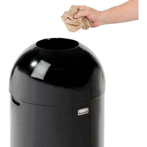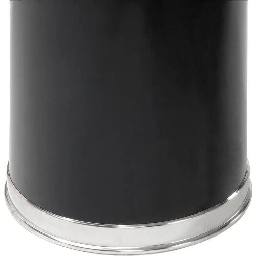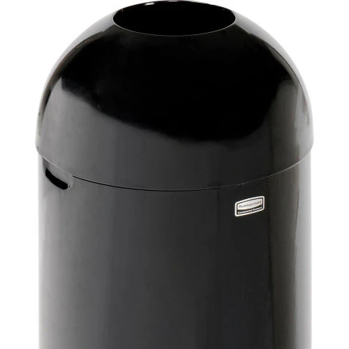 Round Open Top Trash Can is a 15 gal receptacle. Features hands free open top design with recessed side handles for easy emptying. Complete with a Galvanized Steel (GL) liner and a black, powder coated finish. Non-Corrosive base ring protects floors.