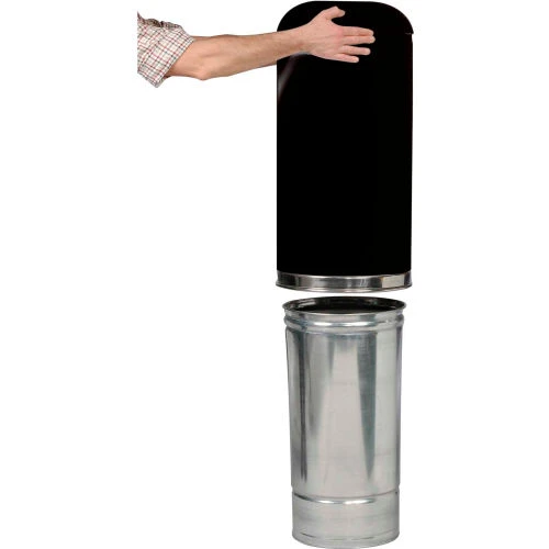 This rugged receptacle with weatherproof and UV protected durable high gloss finish features an open top. Recessed handgrips permit easy outer container lift-off. Base is non-marring stainless steel.