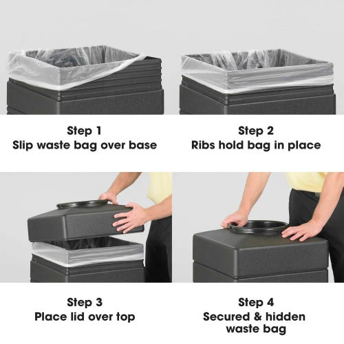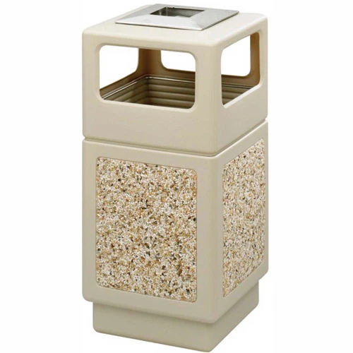 Looking for a receptacle that blends in with any environment? The striking, molded-in stone aggregate will add beauty to your “First Impression” areas. Molded from high density polyethylene with built-in UV inhibitors. The telescoping base hides bag and it has an attractive design with recessed bottom. 38-gallon capacity; uses standard 32″ x 44″ trash bags. Easily adaptable for anchoring or weighting devices. Tan color finish.