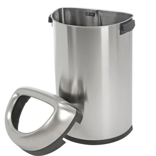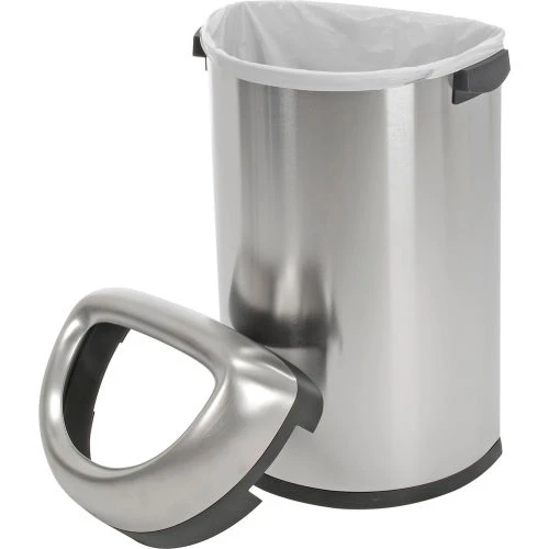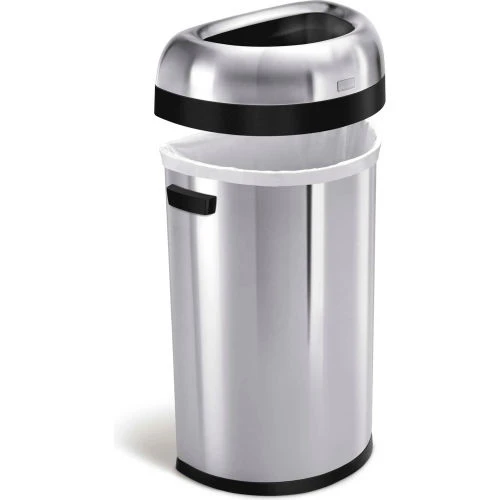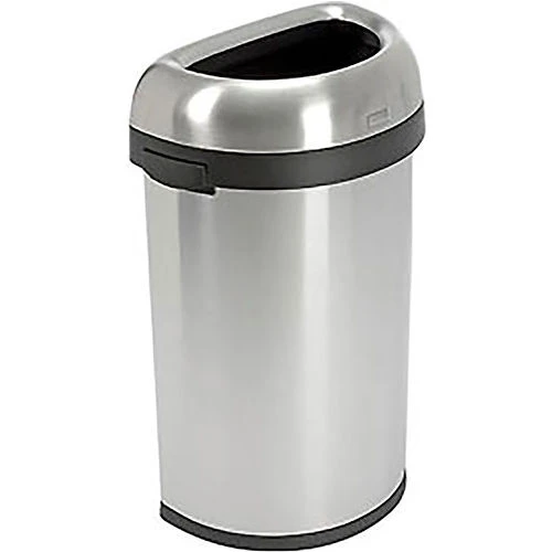 The simplehuman® semi-round open can has a flat back for placement against the wall and out of the way, while its open lid design makes it easy to toss in trash on the go. The heavy-gauge stainless steel construction, lift-off lid, and large capacity make it an ideal choice for commercial spaces such as restaurants and coffee shops, or even busy families.