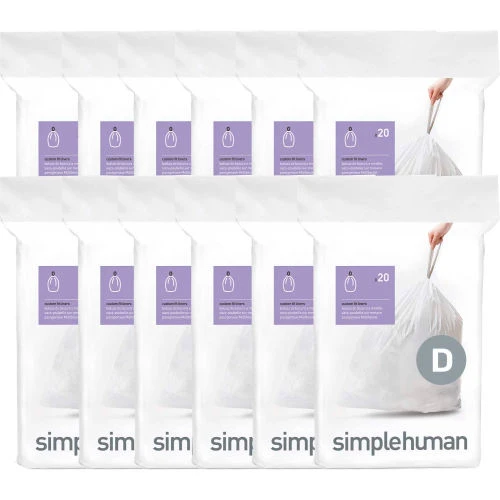 simplehuman custom fit trash can liners are designed to fit each of our cans perfectly so there is no messy bag overhang or bunching — and they never slip. Extra-thick plastic and double-seam construction prevent rips and tears. Strong drawstring handles make the liners easy to lift, tie, and carry.