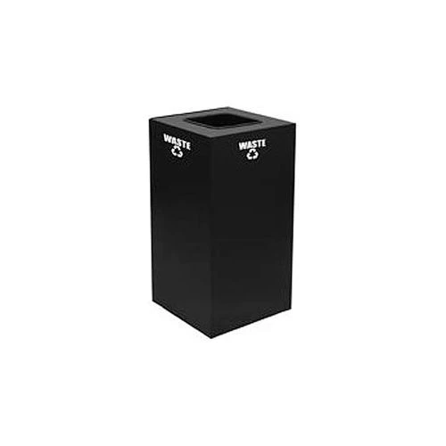 This square recycling container provides large capacity for efficient recycling waste disposal. Ideal for cafeterias, lunchrooms, schools and any other facility that recycles waste. Waste container is made with fire-safe steel for long life and durability. Large 15″W x 15″D square opening is covered by a hinged lid to protect contents while containing odors. Includes decals for easy recycling and waste identification. Steel bands inside container help retain garbage bags for easy maintenance.
