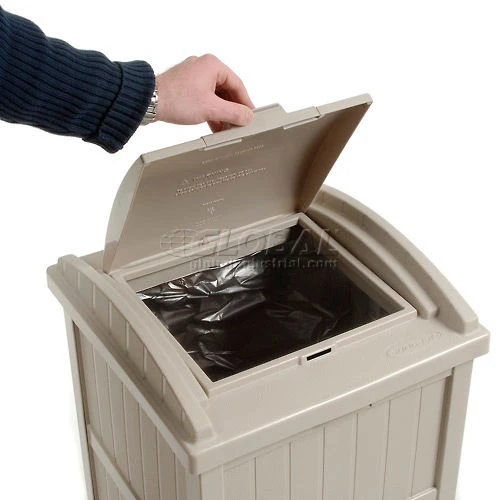 Styled to look attractive for patios and eating areas, receptacle includes a latching lid to keep waste out of sight. Long lasting taupe resin construction withstands outdoor use and includes a solid bottom panel. 24 gallon capacity is designed for 30-33 gallon disposable liners. Measures 15-3/4″W x 16″D x 31-5/8″H. Easy assembly.