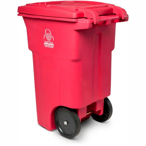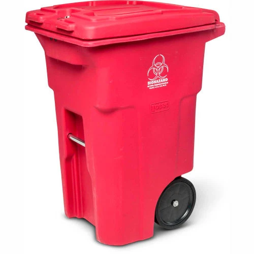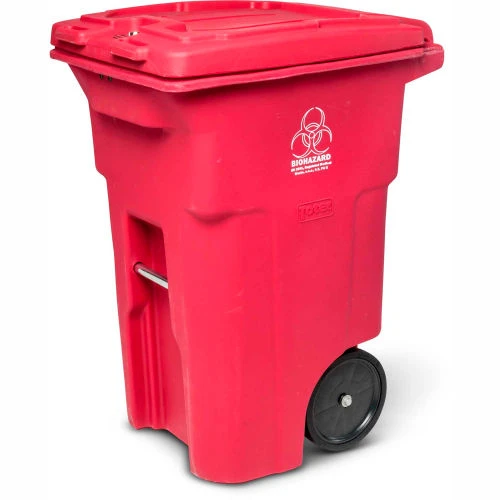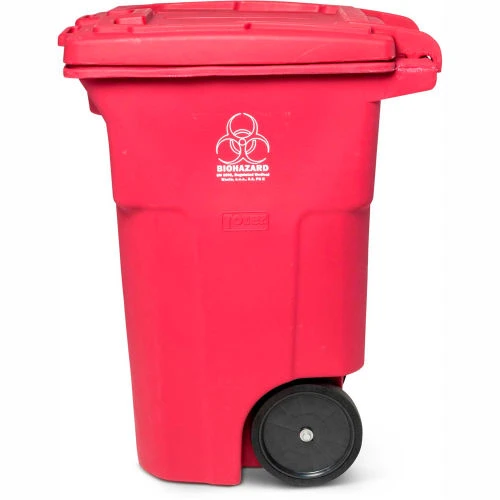 - Biohazard logo heat stamped on a distinctive red trash can signify the potential presence of a biological hazard inside the container