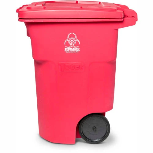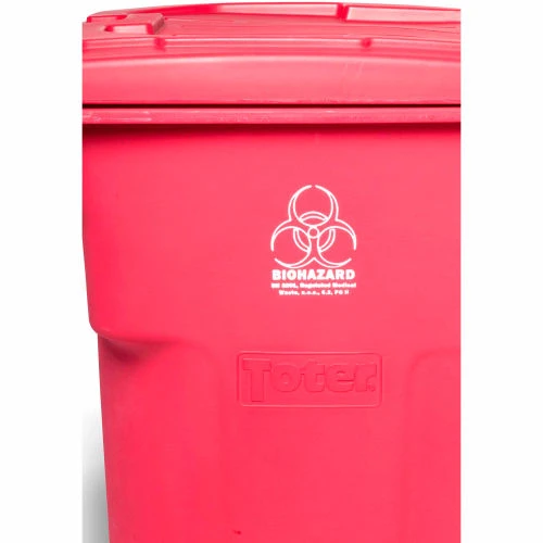 - Biohazard logo heat stamped on a distinctive red trash can signify the potential presence of a biological hazard inside the container