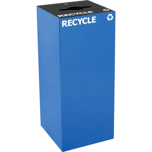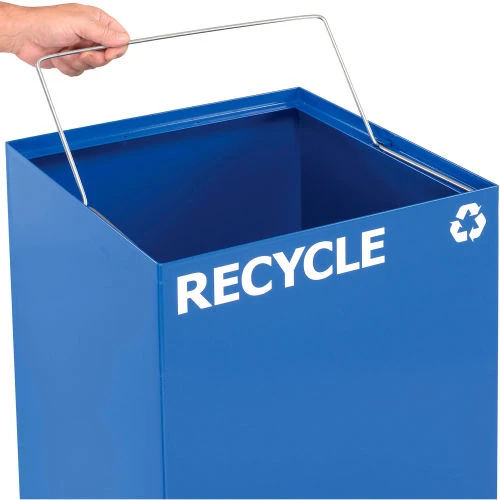 This square recycling container provides large capacity for efficient recycling waste disposal. Ideal for cafeterias, lunchrooms, schools and any other facility that recycles waste. Waste container is made with fire-safe steel for long life and durability. Large 15″W x 15″D square opening is covered by a hinged lid to protect contents while containing odors. Includes decals for easy recycling and waste identification. Steel bands inside container help retain garbage bags for easy maintenance.